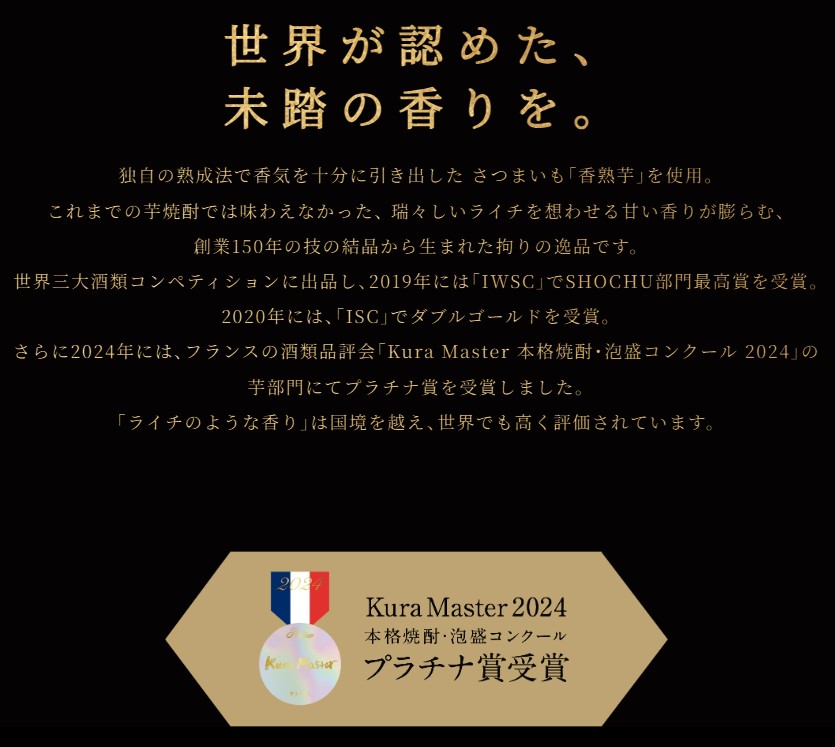 世界が認めた、未踏の香りを。独自の熟成法で香気を十分に引き出した さつまいも「香熟芋」を使用。これまでの芋焼酎では味わえなかった、 瑞々しいライチを想わせる甘い香りが膨らむ、創業150年の技の結晶から生まれた拘りの逸品です。世界三大酒類コンペティションに出品し、2019年には「IWSC」でSHOCHU部門最高賞を受賞。2020年には、「ISC」でダブルゴールドを受賞。 さらに2024年には、フランスの酒類品評会「Kura Master 本格焼酎・泡盛コンクール 2024」の芋部門にてプラチナ賞を受賞しました。「ライチのような香り」は国境を越え、世界でも高く評価されています。