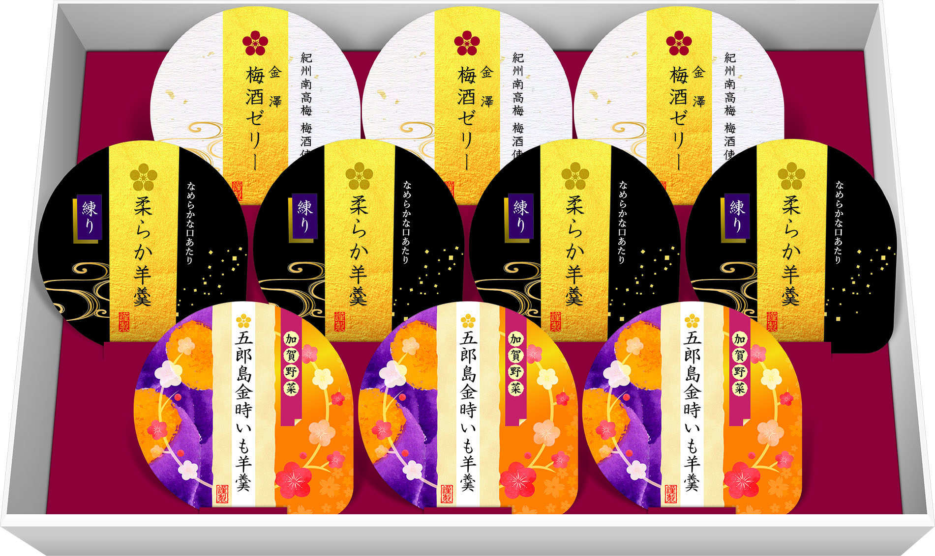 加賀野菜・五郎島金時を使った五郎島金時いも羊羹、なめらかな口当たりとさらっとした喉ごしにこだわった柔らか羊羹、紀州南高梅梅酒で作った金澤梅酒ゼリー。
