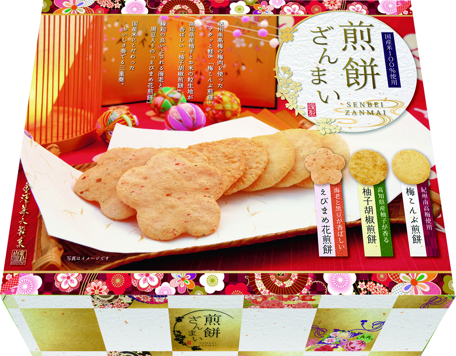 紀州南高梅入り梅こんぶせんべい、花型でえびと黒豆を使ったえびまめ花せんべいを詰合せました。
