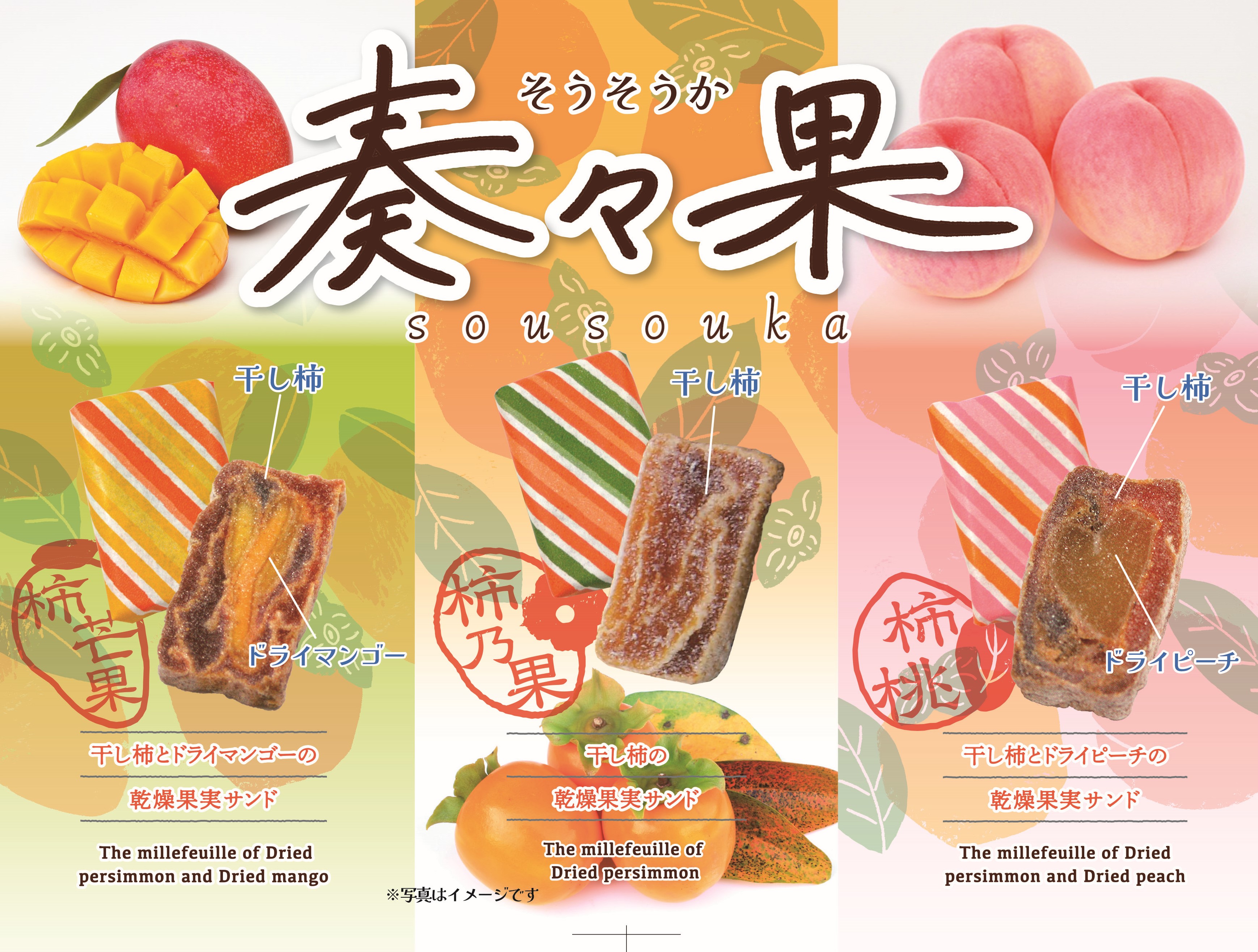 手に取りやすいポップなパッケージの干し柿とドライピーチのコラボレーションをお楽しみください。