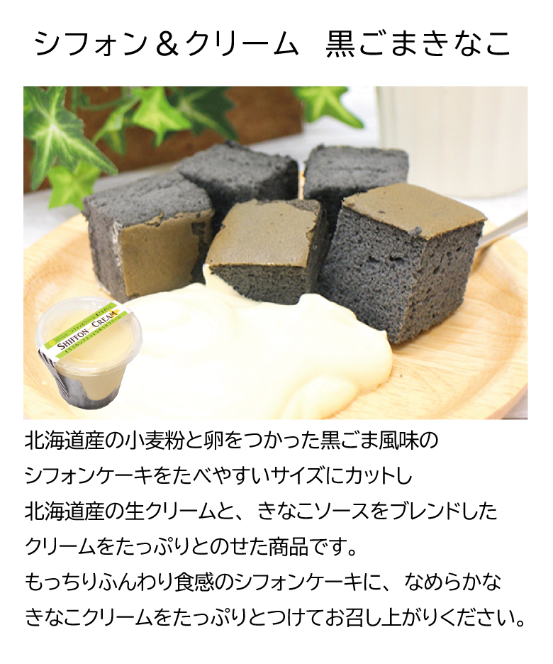 ふんわり黒胡麻シフォンにきなこソースと生クリームをブレンドしたホイップクリームです。