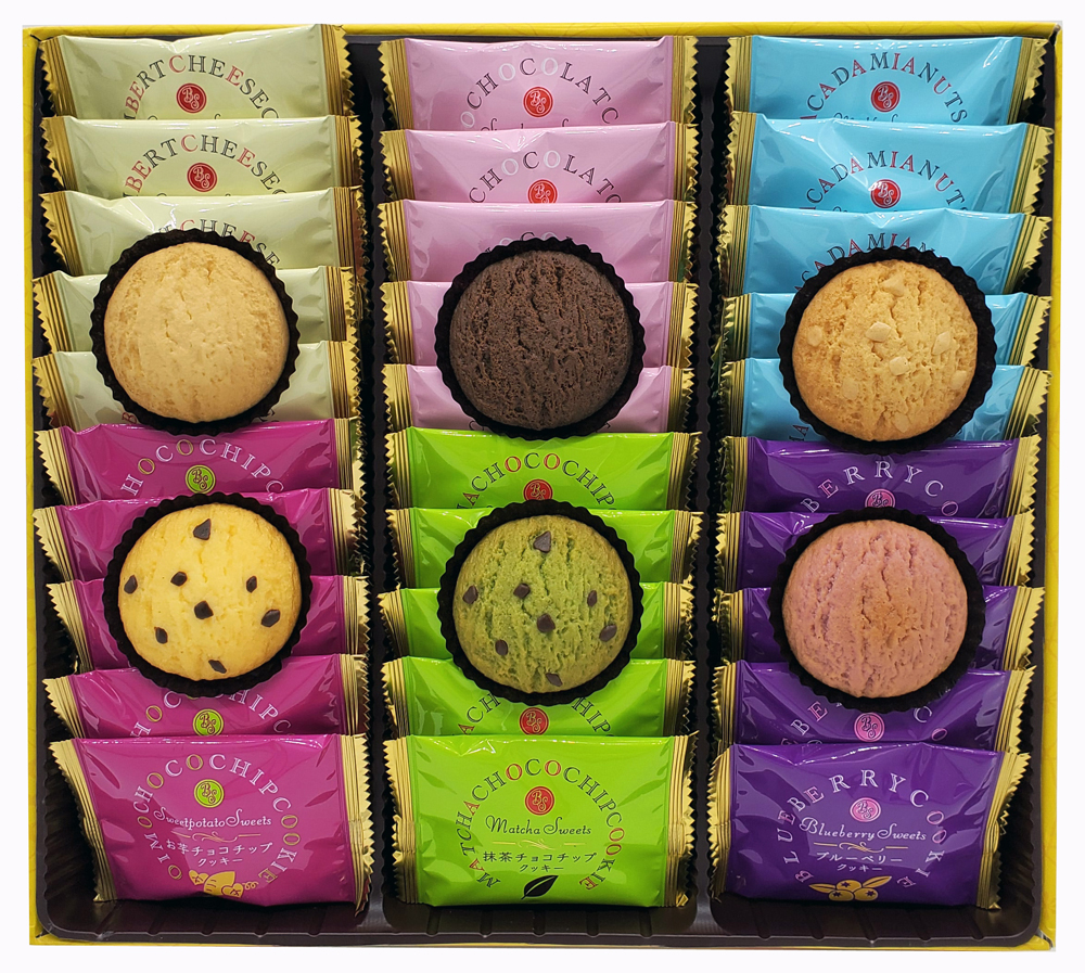 チーズ、いちごショコラ、抹茶チョコチップ、お芋チョコチップ、ミルクマカダミア ナッツ、ブルーベリーも6種の風味のクッキーの詰め合わせです。