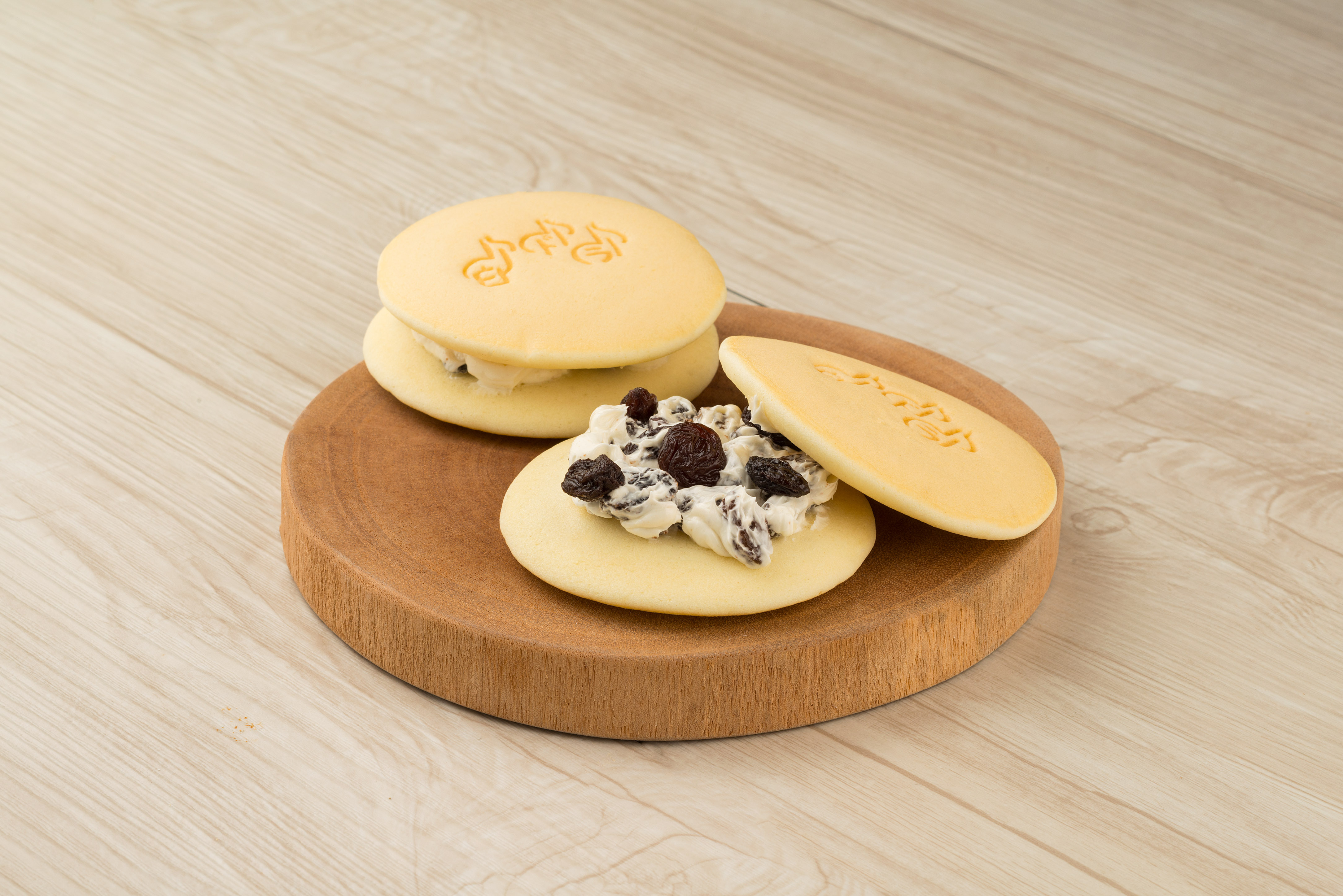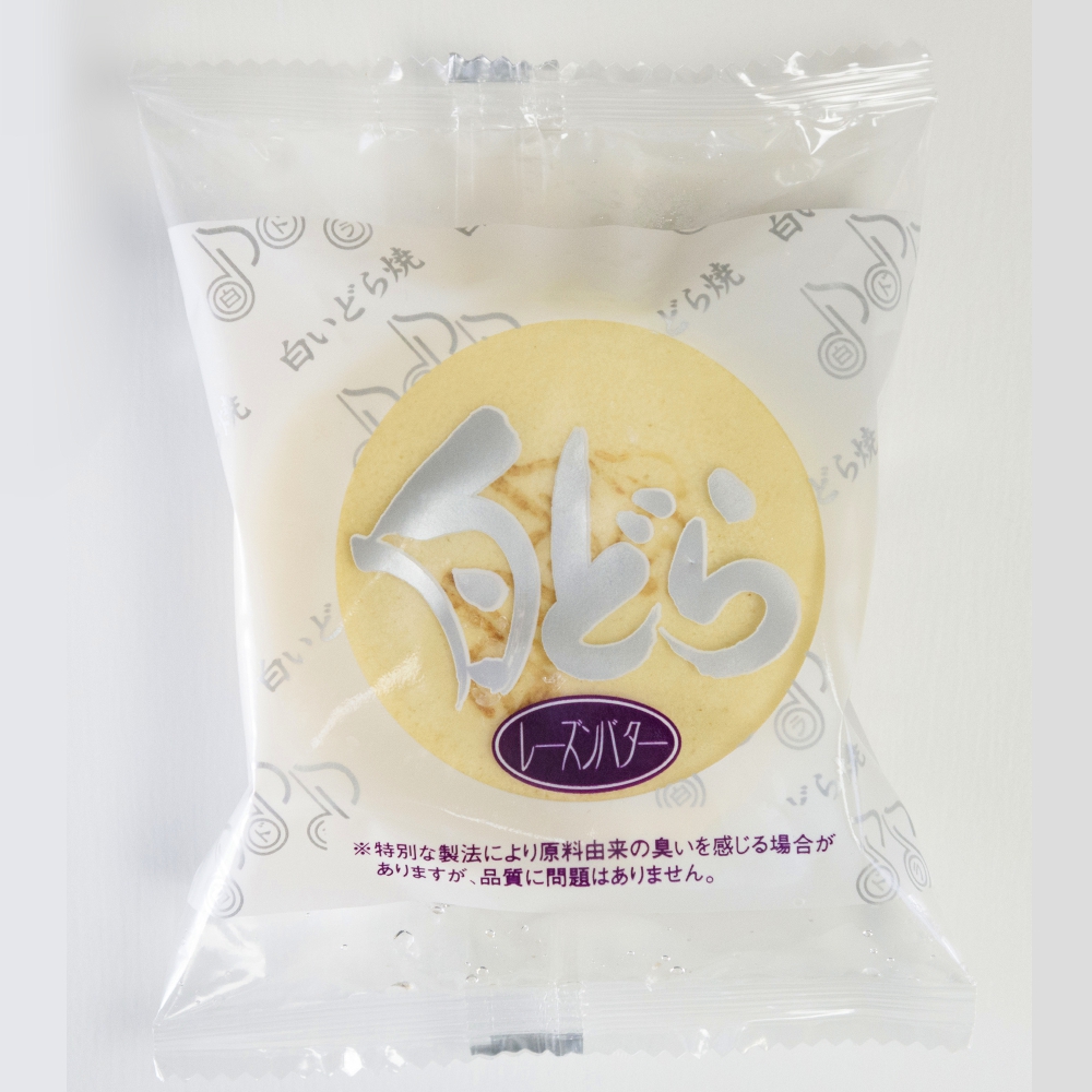 しっとりとした口当たりが優しいふんわりしたこだわりの白皮が目を引く美しい白いどら焼き「白どら」。たっぷりのレーズンが入ったレーズンバターをサンドした、和と洋が上手にまとまった珍しい「どら焼き」です。