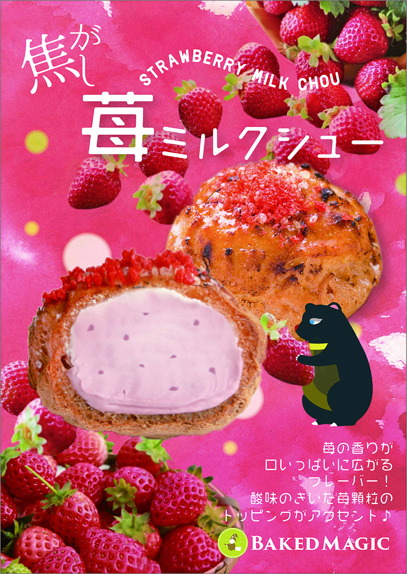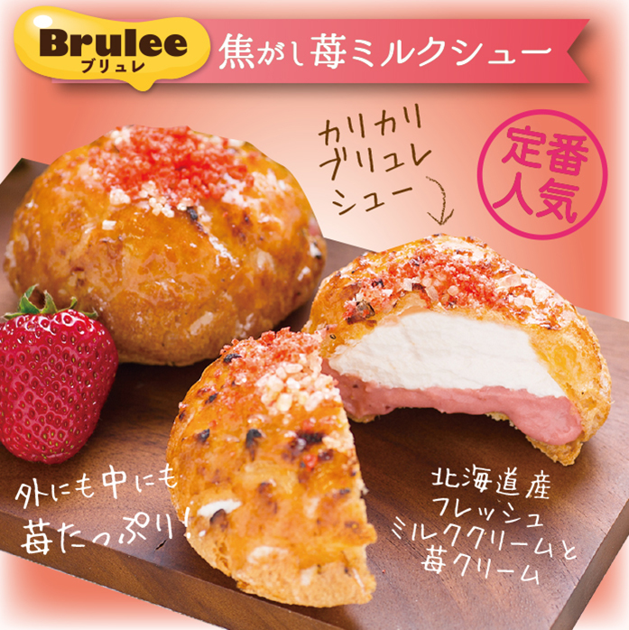 キャラメルミルクシューのカリカリブリュレの食感はそのままに、中にも外にもたっぷり苺をトッピングした甘酸っぱい風味がたまらない逸品です。